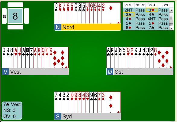 Tommy (V) og Petter (Ø) kom i 7 spar som ble meldt som vist i diagrammet under.
