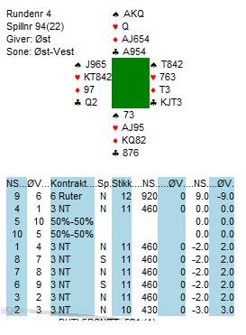 Utspillet var spar 10 og på 4 ganger spar har ingen de helt store problemer, men på fortsettelsen blir det krise for Nord. På tre ganger ruter og stjeling av den 4 og hjerter hjem var Nord ferdig. I digrammet ser en også at i 7NT så hadde det holdt og spilt spar 6. Da kan også Nord bare pakke sammen.